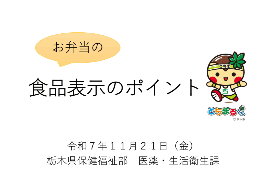 続いて「食品表示・お弁当の食品表示のポイント」です。引き続き栃木県保健福祉部医薬・生活衛生課様にしていただきました。