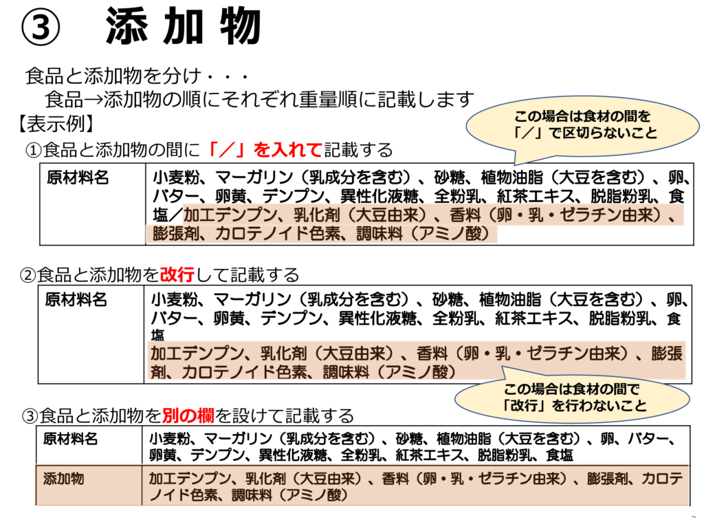 消費者からすると添加物も気になるところですよね?それもルールが細かく決められています。加工助剤やキャリーオーバーなど表示が不要なものもあります。キャリーオーバーでも甘味料、調味料、着色料、香料など人の五感に訴えるようなものについては表示が必要です。