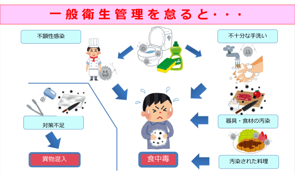 内容は近年起こった事例をもとに行います。その原因や問題点を知る事により、日々の衛生管理に問題が無いか確認する事、また事例と実害を知る事により食中毒や異物混入の怖さを改めて認識し、気を引き締めるとともに衛生意識の向上、ひいては発生予防に繋げる事を目的としております。