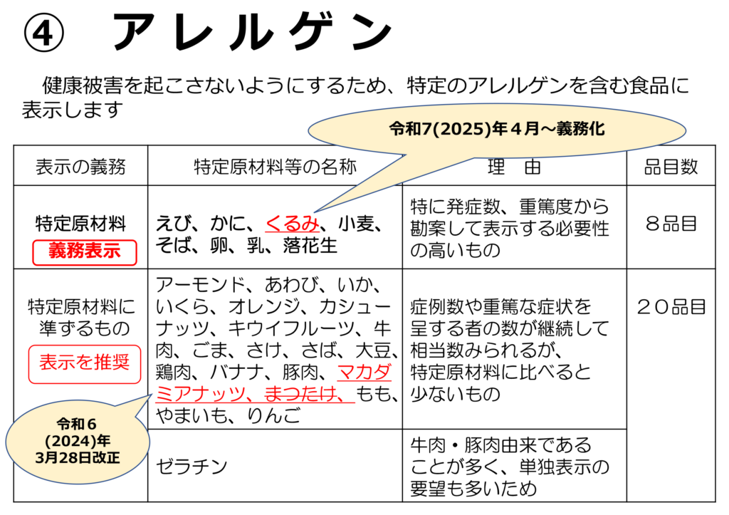 そしてアレルゲン表示。これも大事な事です。令和7年4月に「くるみ」が特定原材料に加えられました。また、カシューナッツやピスタチオについても表示改正の方向で進むそうです。これは消費増加に伴う発症事例の増加が理由のひとつだそうです。最悪の場合、命に関わる大事な部分ですからしっかり表示しないといけません。もちろんコンタミの防止も必要です。