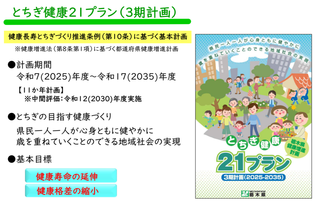 栃木県では、「とちぎ健康21プラン」とした3期計画を実施しています。